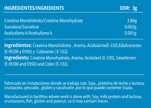 MODO DE EMPLEO: Añadir 3g de producto (3/4 cacito) a 200ml de agua y remover. No consumir más de 1 dosis diaria debido a su contenido en creatina monohidrato.